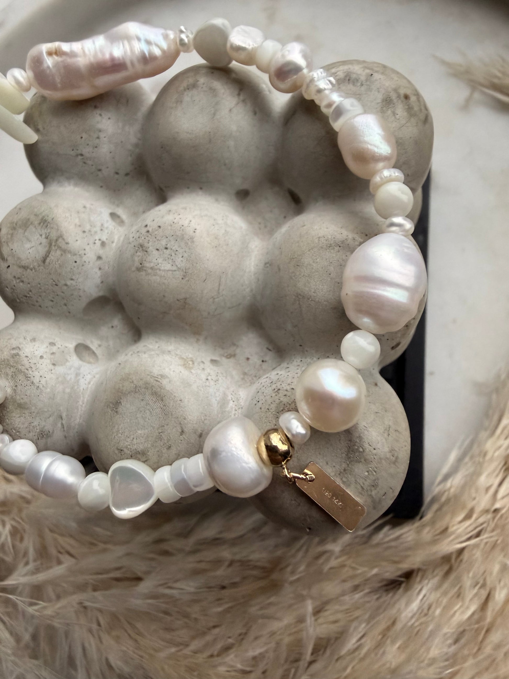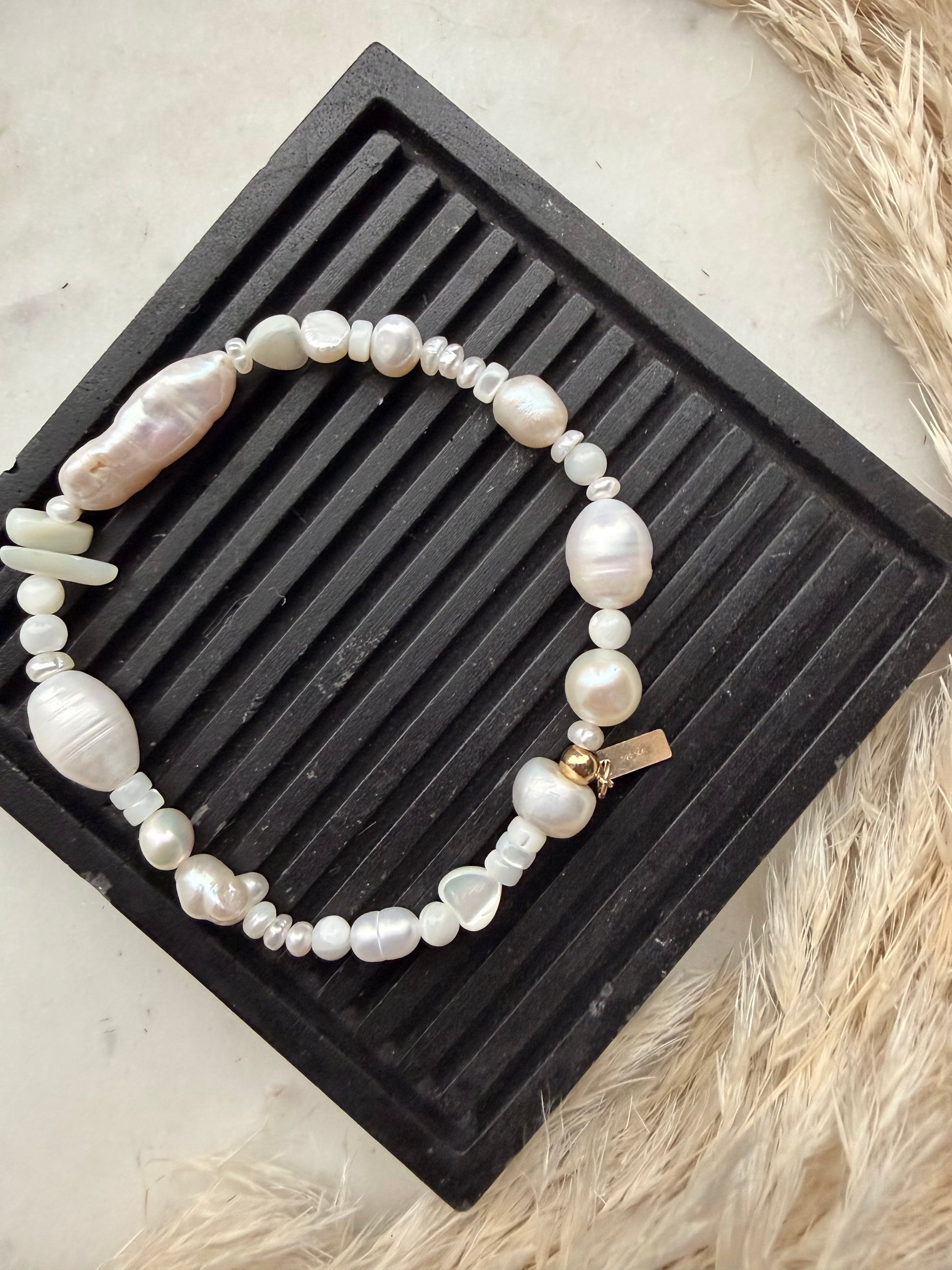 a perfect curation of freshwater and mother pearls strung with your choice of gold filled or sterling silver accent & tag