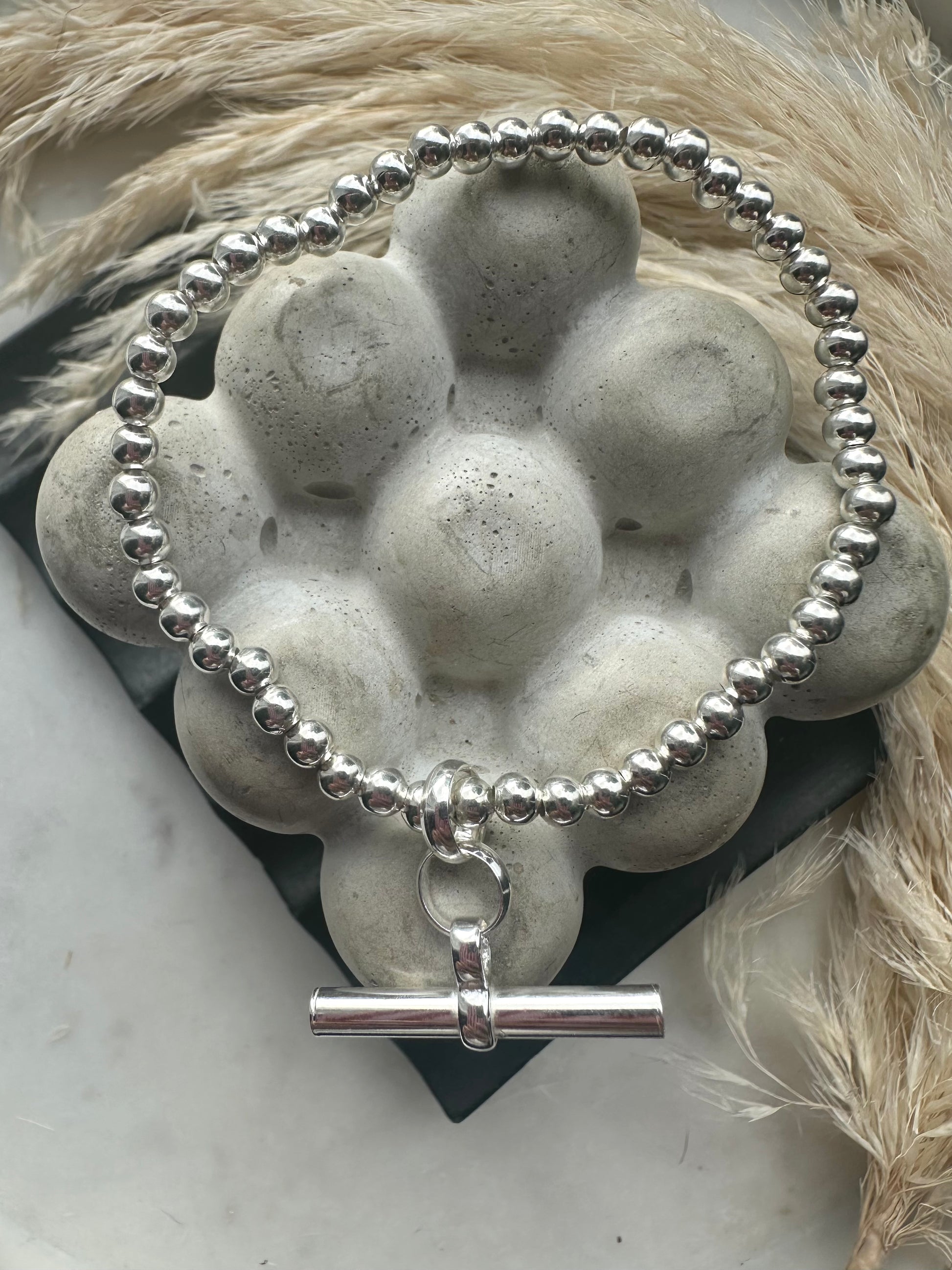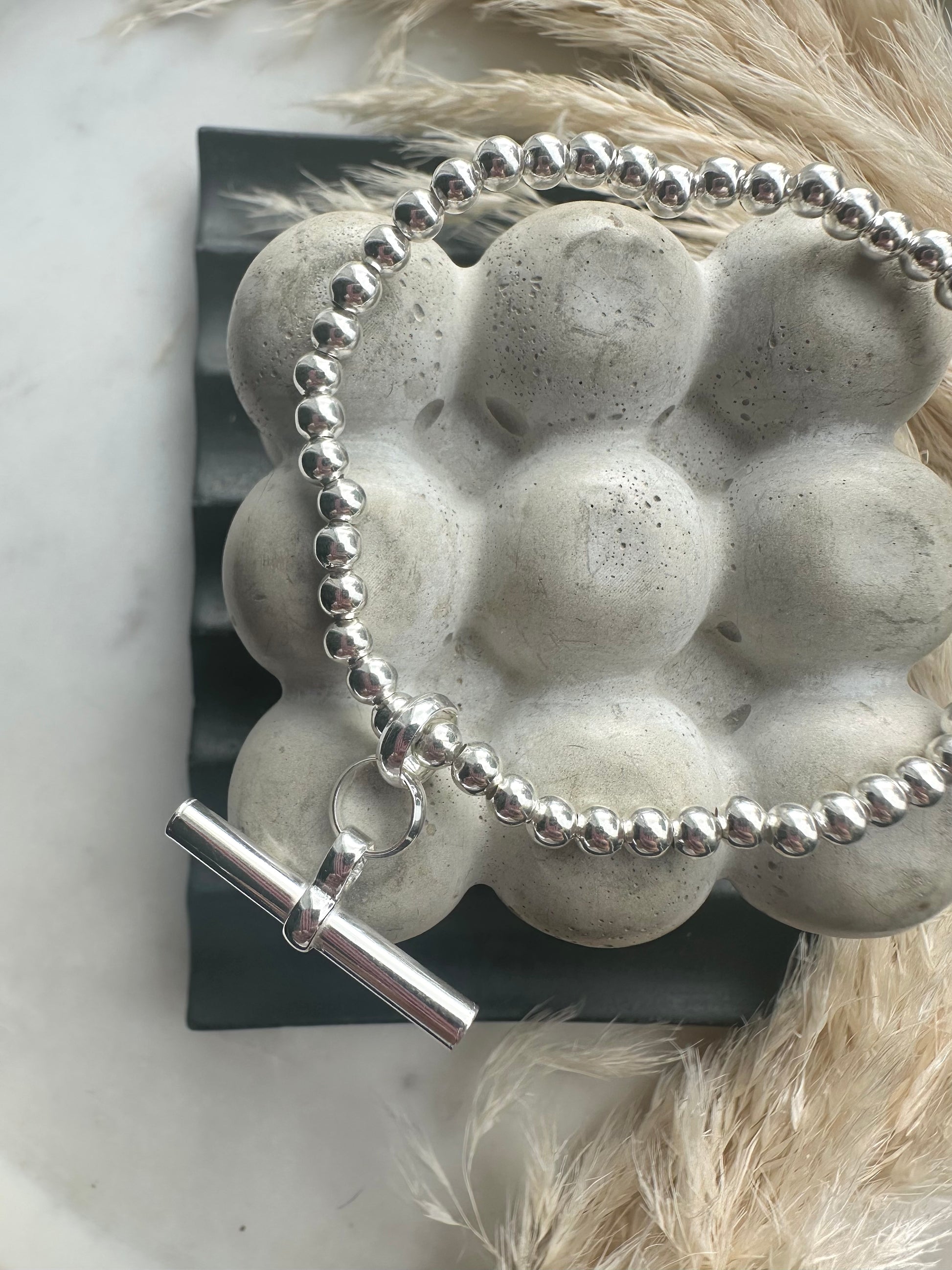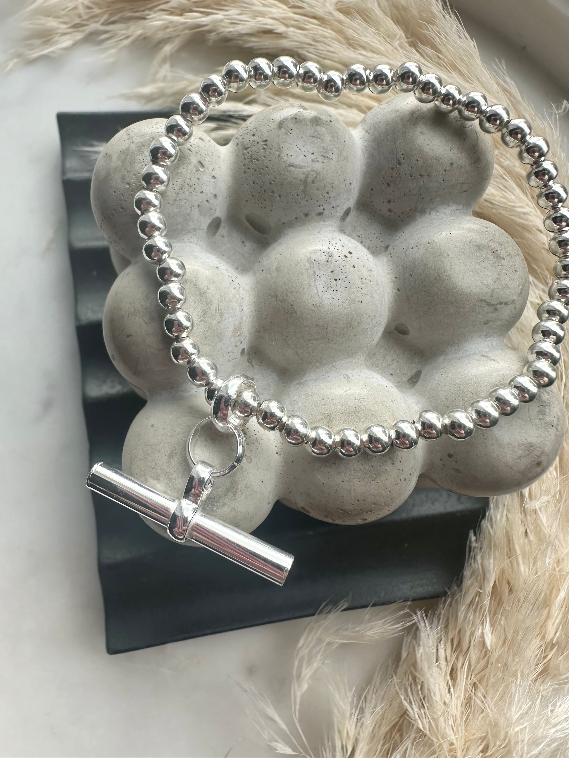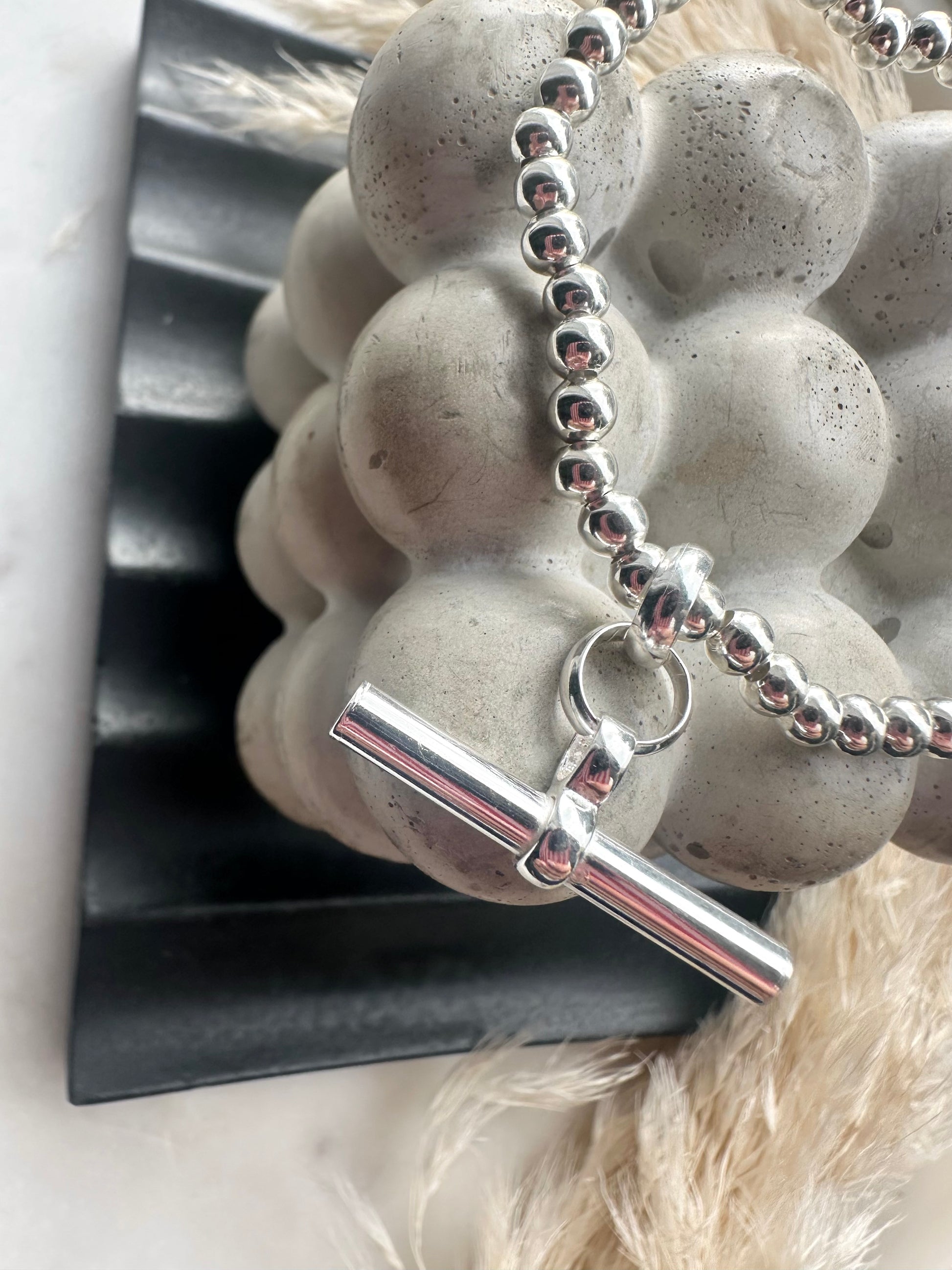 This stunning piece is made from sterling silver beads with a chunky sterling silver t-bar pendant. Quite simply a statement piece.