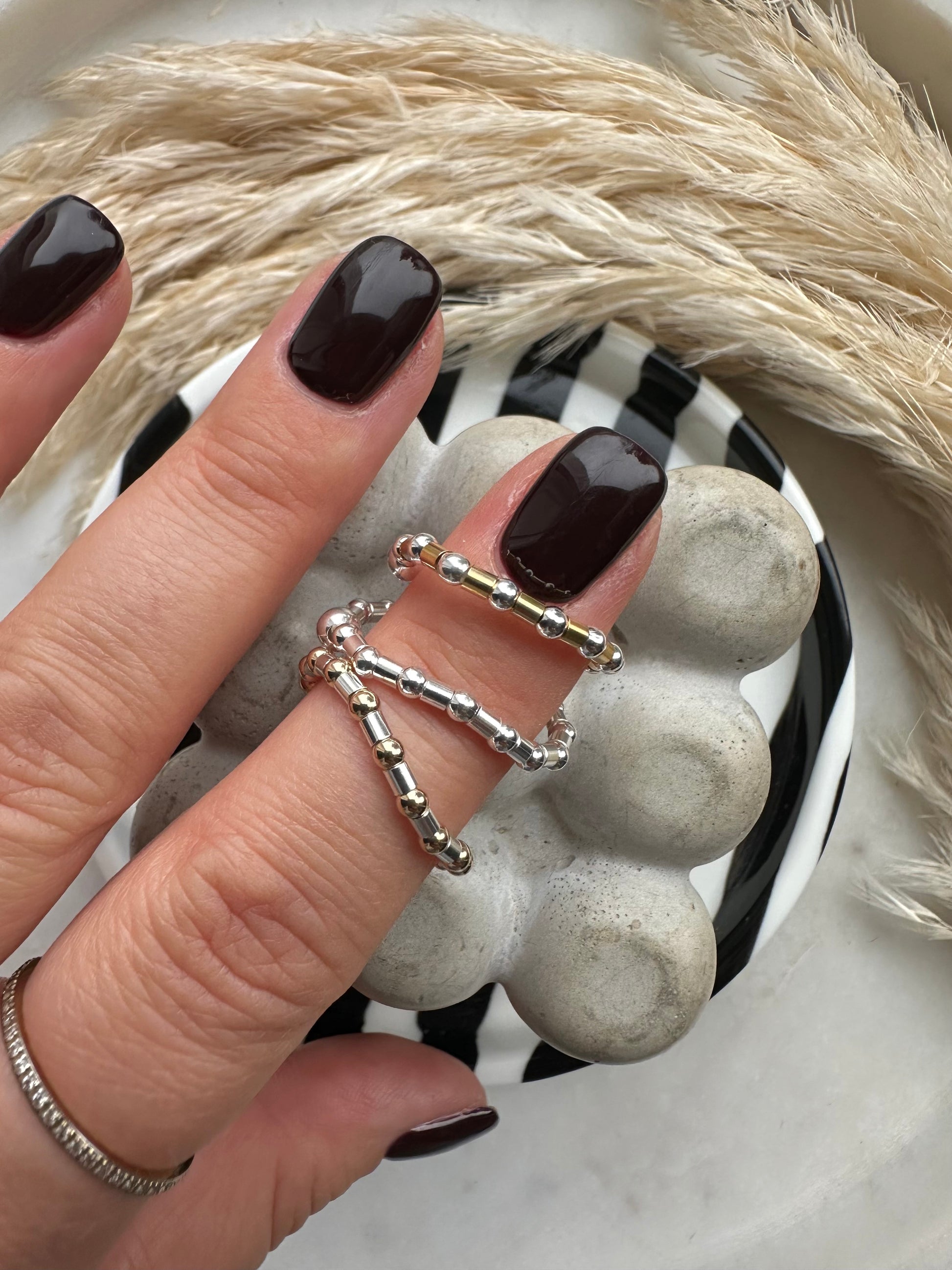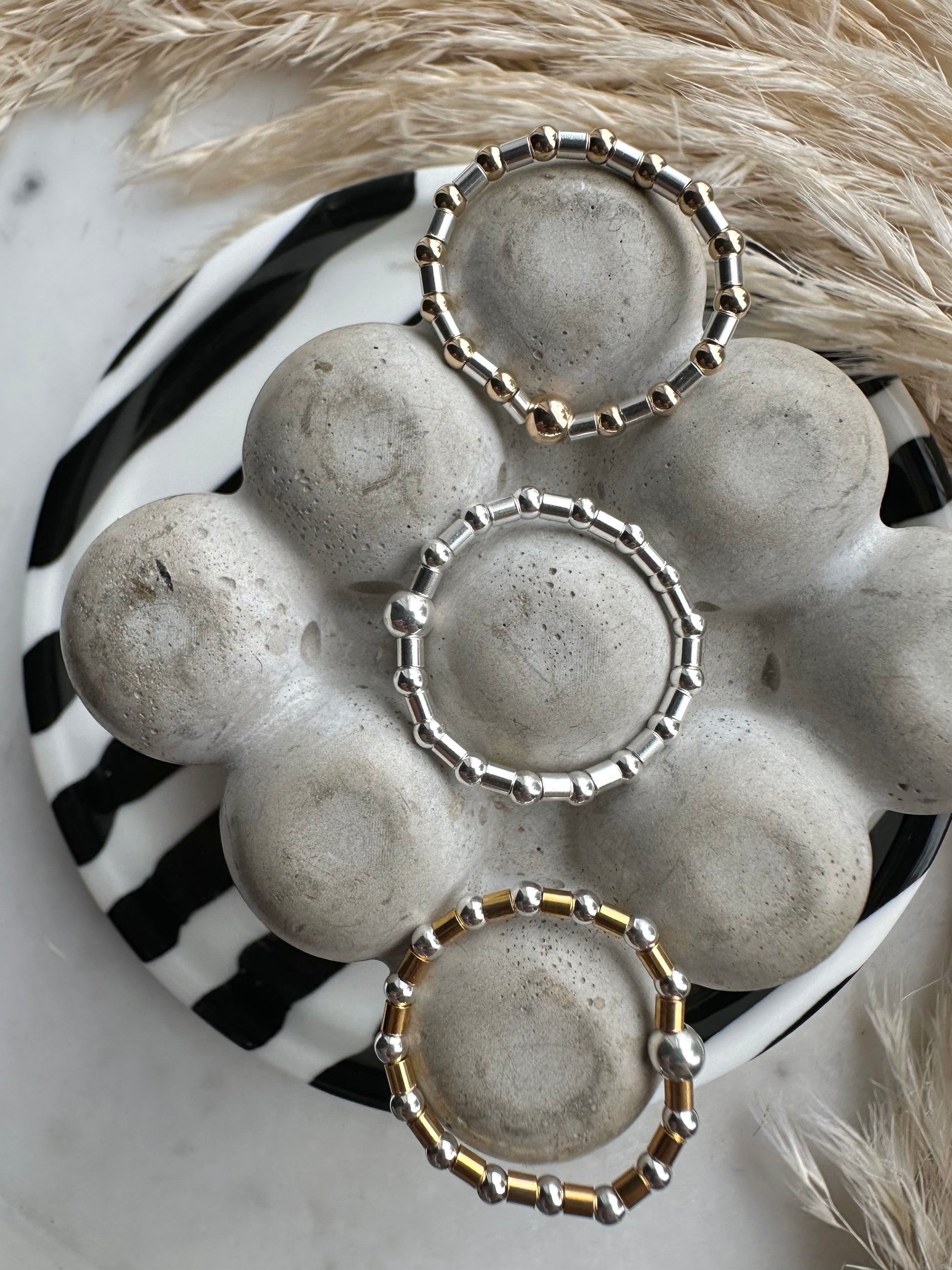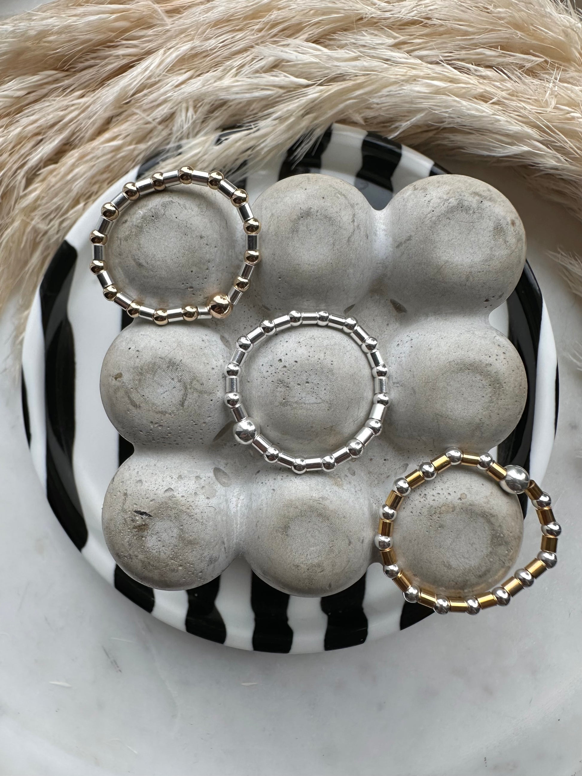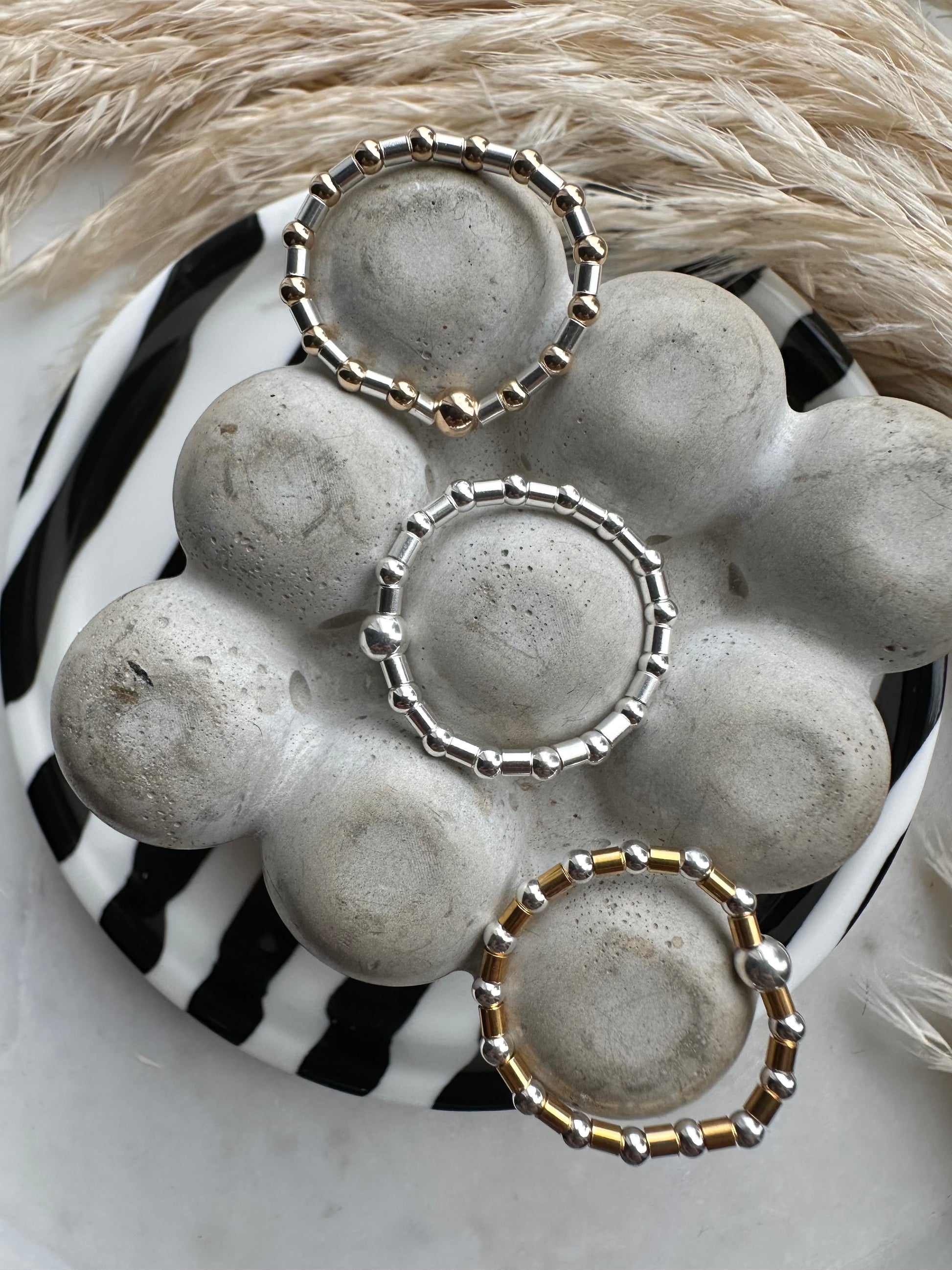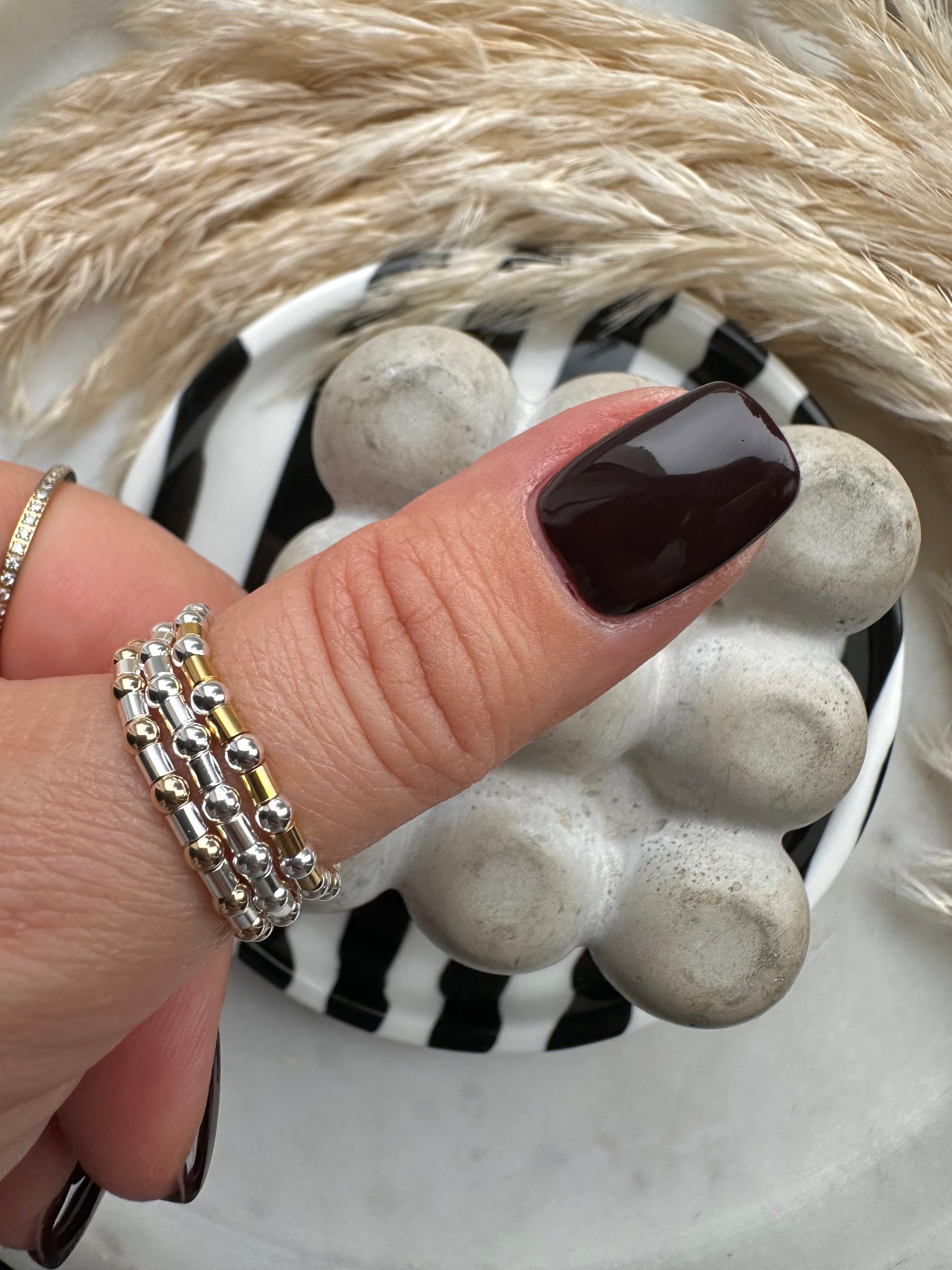 Gold filled and sterling silver tiny tube beads strung together to make these handmade rings, perfect for wearing alone or stacking high.