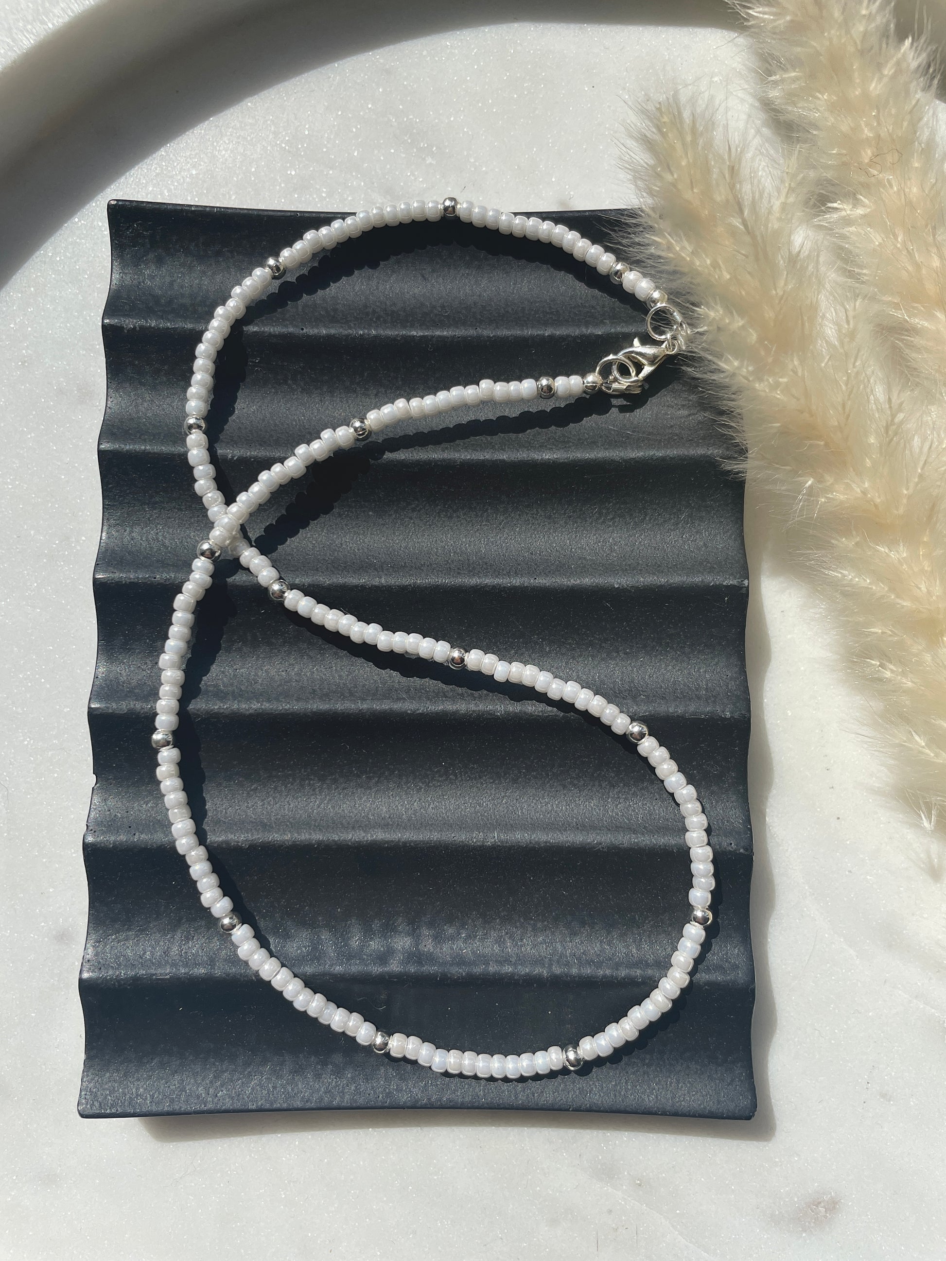 This one is perfect! 3mm glass pearlescent seed beads with silver plated accents (also available in gold) in a 16” choker style or a 18” or 20” length.